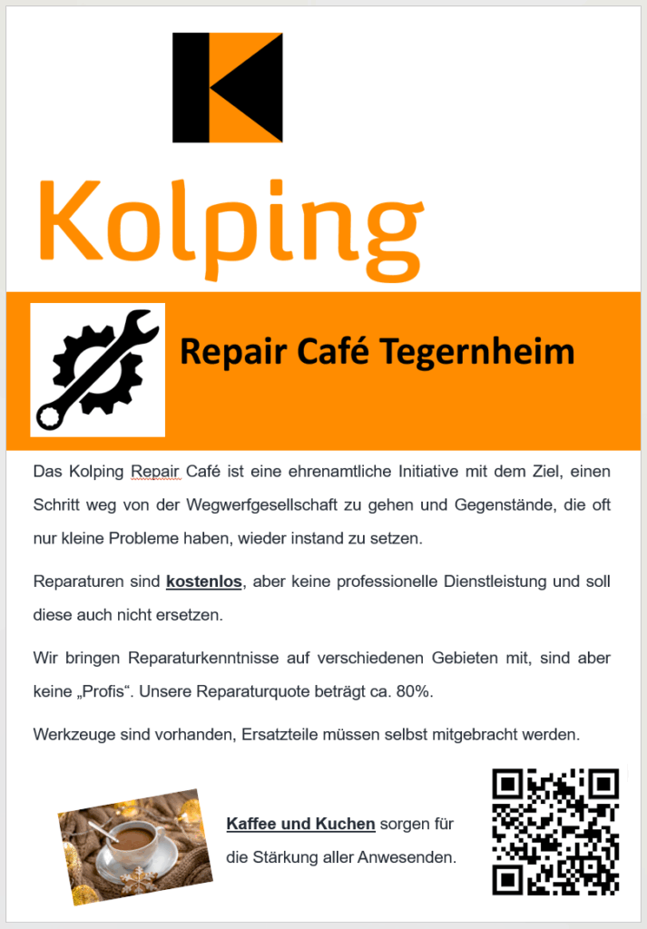 Wir bieten als Kolpingsfamilie Tegernheim seit einiger Zeit ein Repaircafé an.